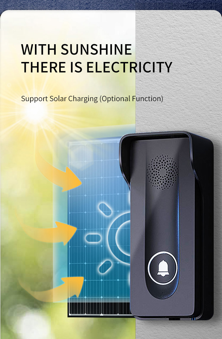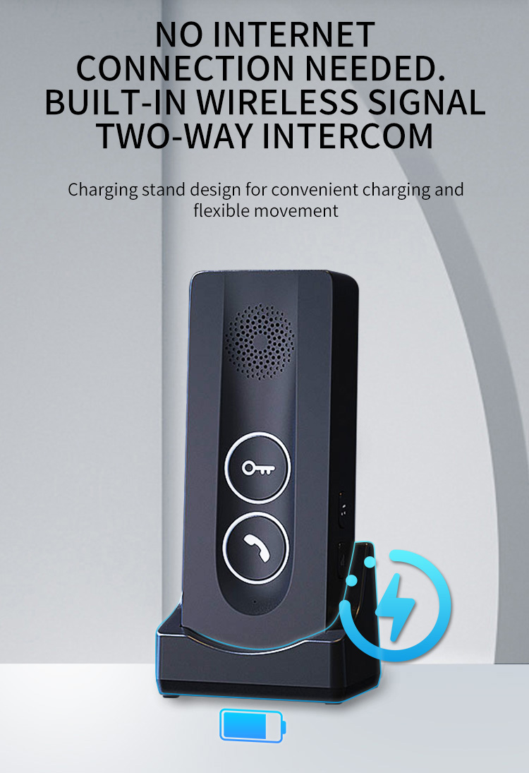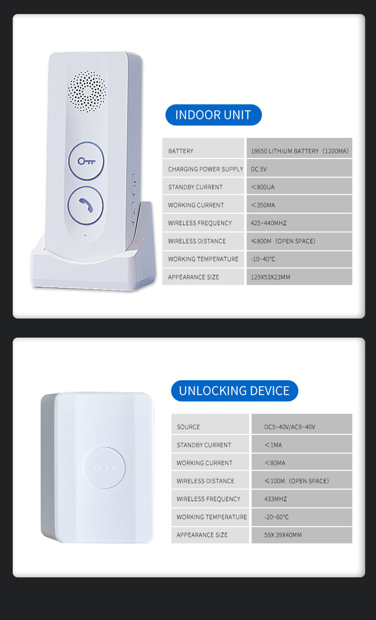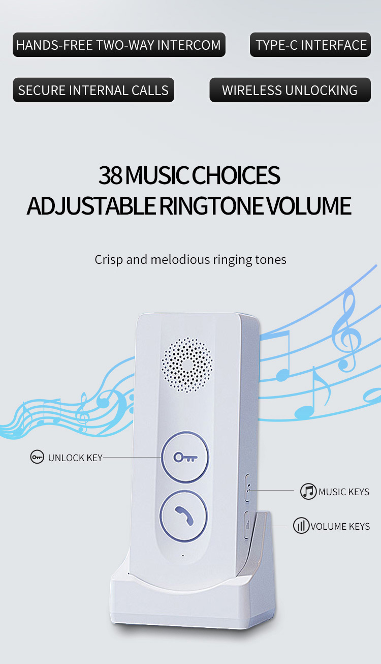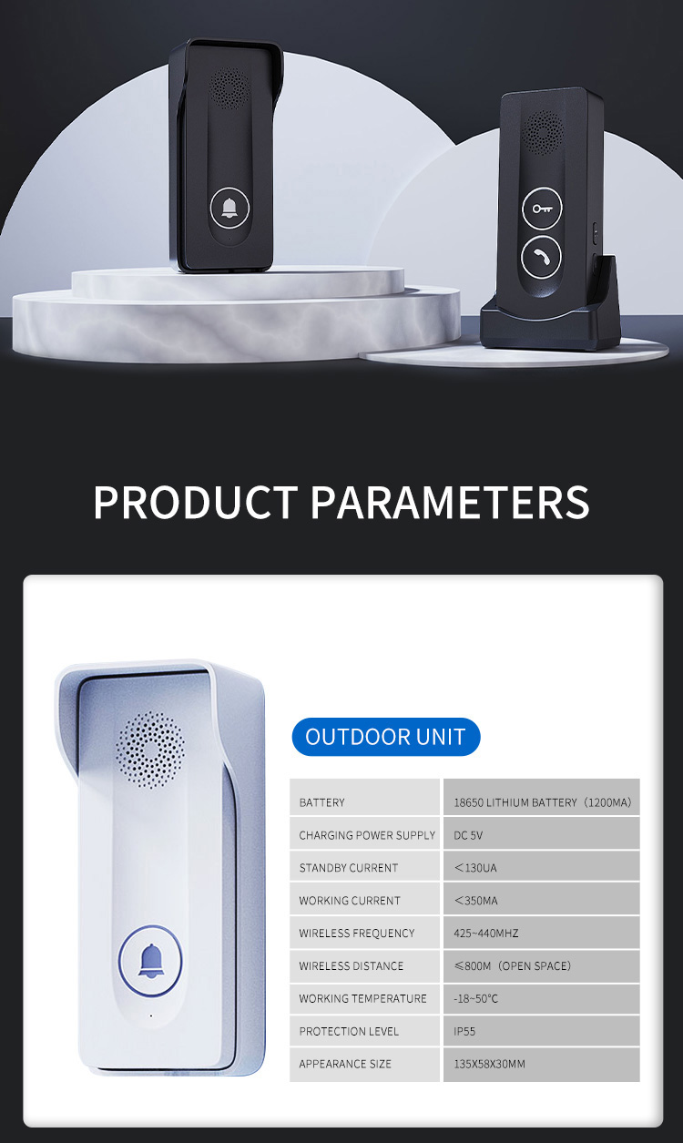 ●Adopting 433MHz public channel, with long distance and strong penetration (about 800-1000 meters in open space) ●18650 battery powered, low power consumption, long standby time ●Outdoor units can be charged with solar panels ●Charging base design for indoor unit, Type-C charging port, same type battery for indoor unit and outdoor unit. ●38 pieces of music, 4 levels adjustable volume ●Indicator light for low battery and charging state ●Two-way hands-free intercom ●433MHz wireless unlocking (this function requires an optional unlocking device) ●Remote key unlocking(optional) ●The outdoor unit has IP55 protection level ●Easy and convenient installation