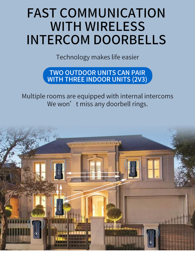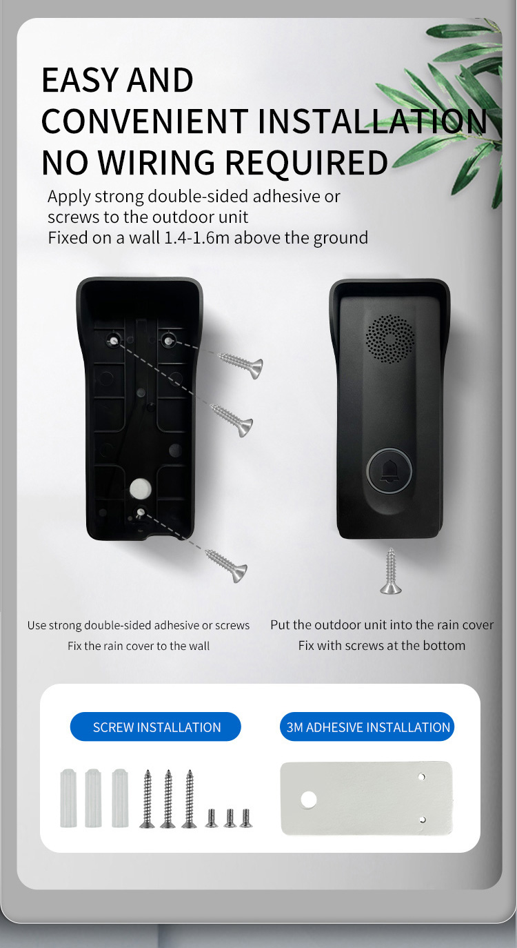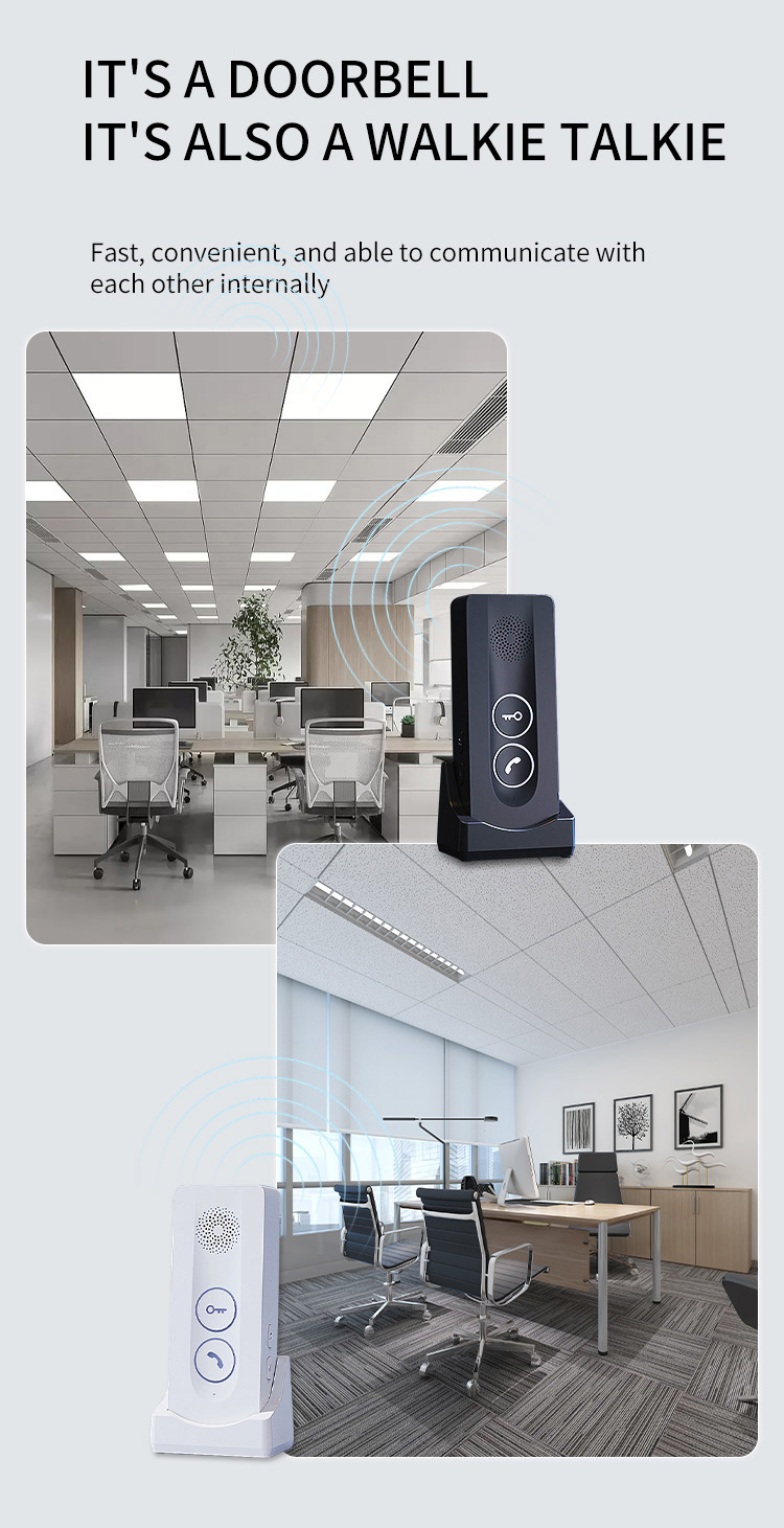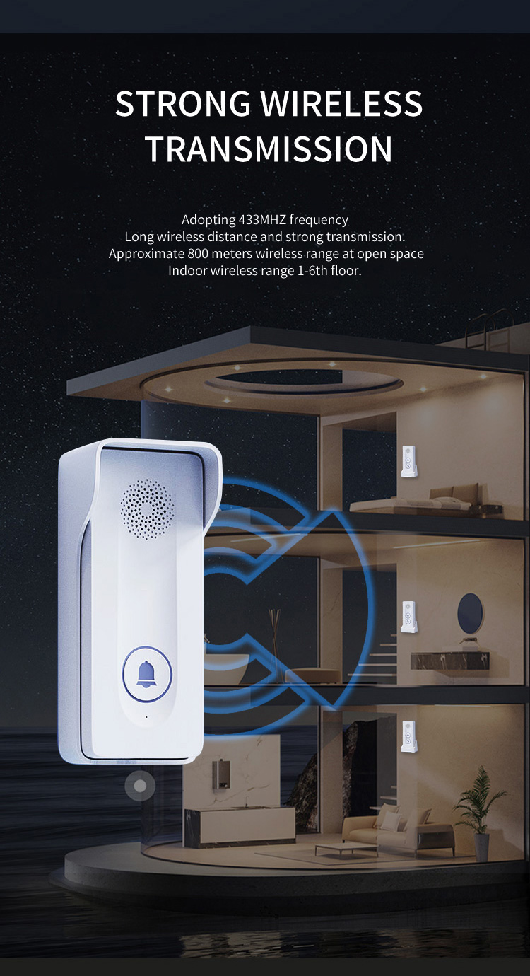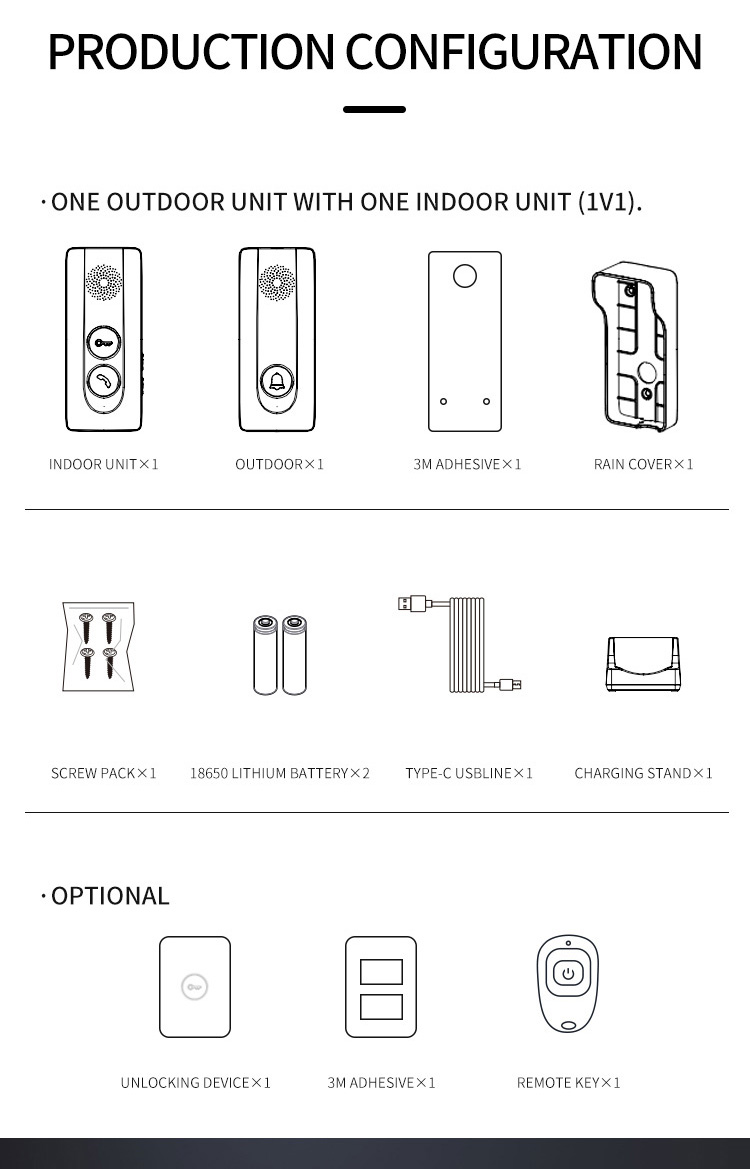 ●Adopting 433MHz public channel, with long distance and strong penetration (about 800-1000 meters in open space) ●18650 battery powered, low power consumption, long standby time ●Outdoor units can be charged with solar panels ●Charging base design for indoor unit, Type-C charging port, same type battery for indoor unit and outdoor unit. ●38 pieces of music, 4 levels adjustable volume ●Indicator light for low battery and charging state ●Two-way hands-free intercom ●433MHz wireless unlocking (this function requires an optional unlocking device) ●Remote key unlocking(optional) ●The outdoor unit has IP55 protection level ●Easy and convenient installation
