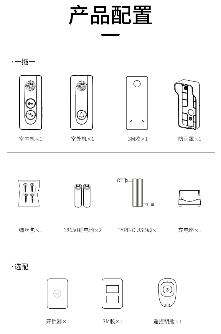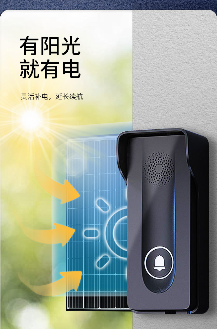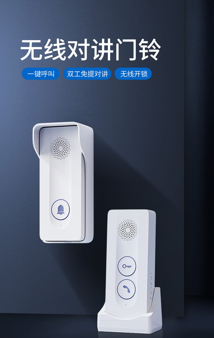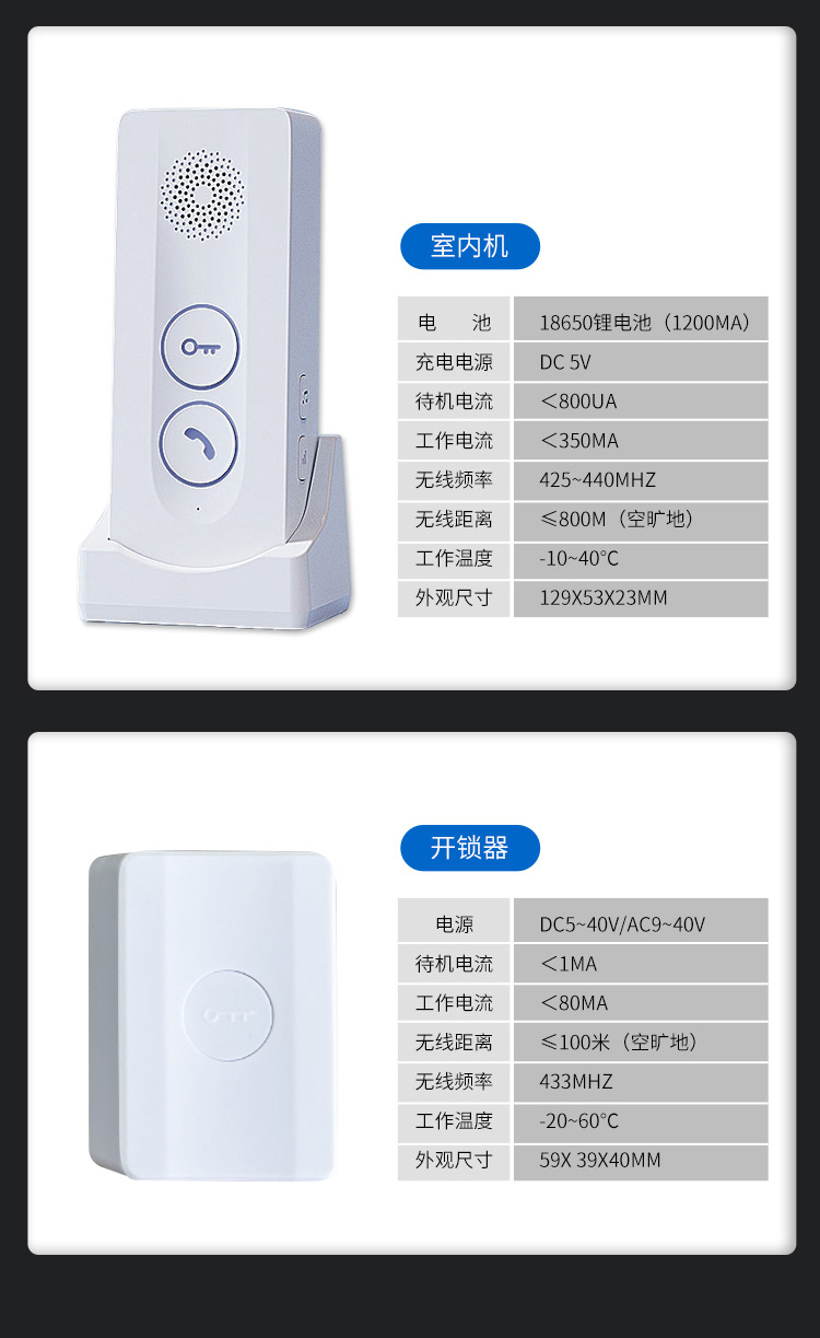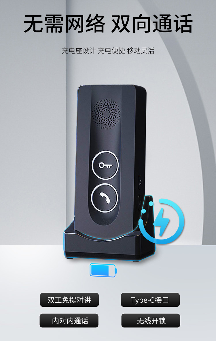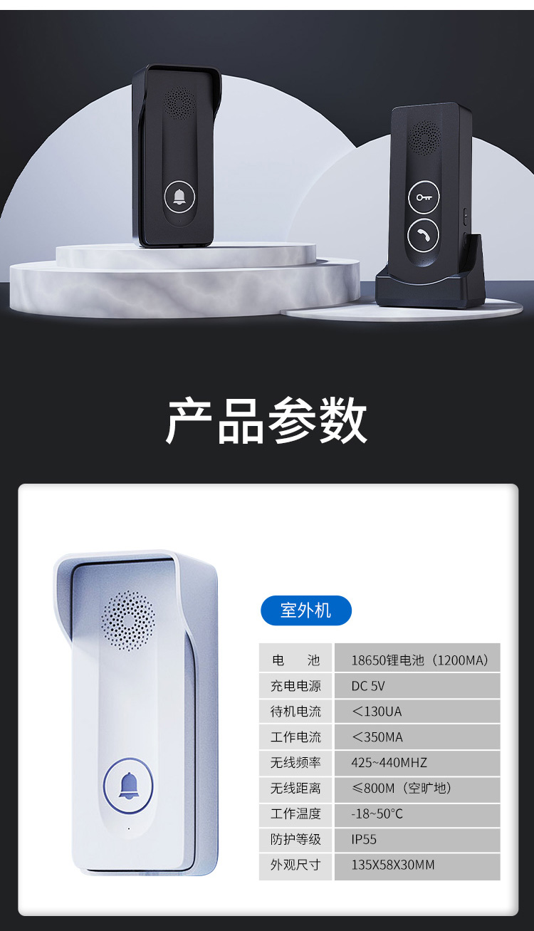 ●采用433MHz公共频道,距离远、穿透力强(空旷地800~1000米左右) ●18650电池供电,低功耗、待机长 ●室外机可用太阳能板充电 ●室内机充电座设计,Type-C充电接口,可与室外机电池轮换充电 ●38首音乐,4档音量可调 ●低电、充电状态指示灯提示 ●双向免提对讲 ●开锁采用433MHz无线开锁(此功能需选配开锁器) ●遥控钥匙开锁(选配) ●室外机具有IP55防护级别 ●安装简单方便